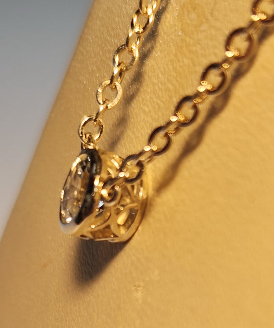 0.45ct clear star brilliant cut Texas topaz is set in a small sterling silver filigree bezel pendant and silver chain