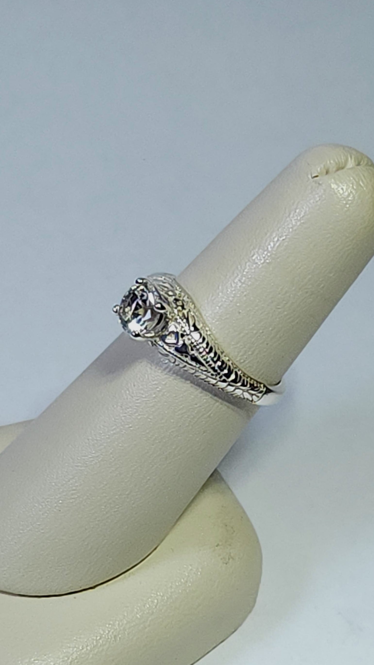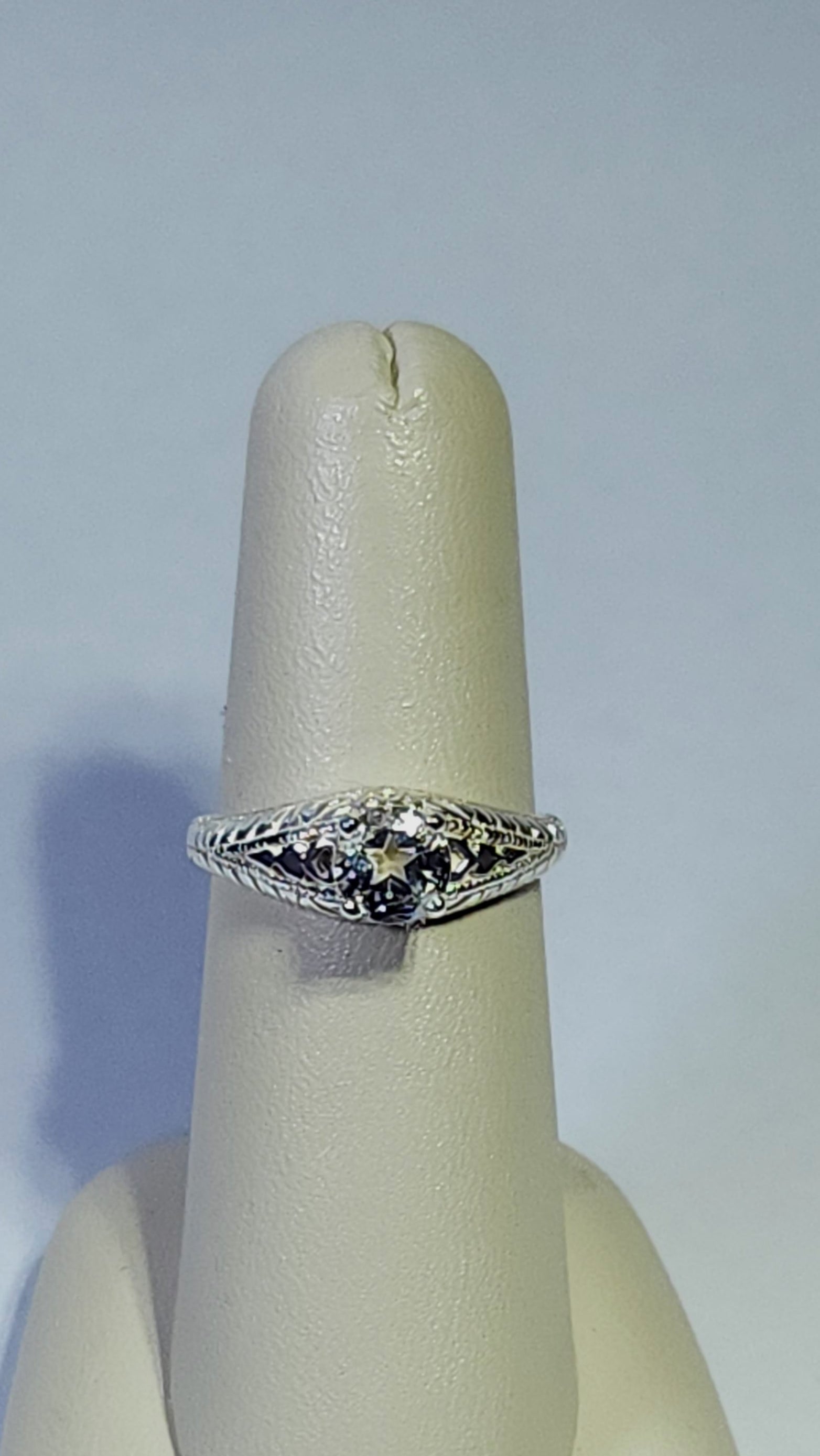 This medium size ring looks like it is woven of sterling silver. Centrally mounted is a prong set clear star brilliant cut topaz from Mason county, Texas which weighs about 0.50ct. The ring is a size 7. The ring tapers from 7.5 mm wide at the top to 2 mm at the bottom of the shank. This ring is great way to show your Texas Spirit.