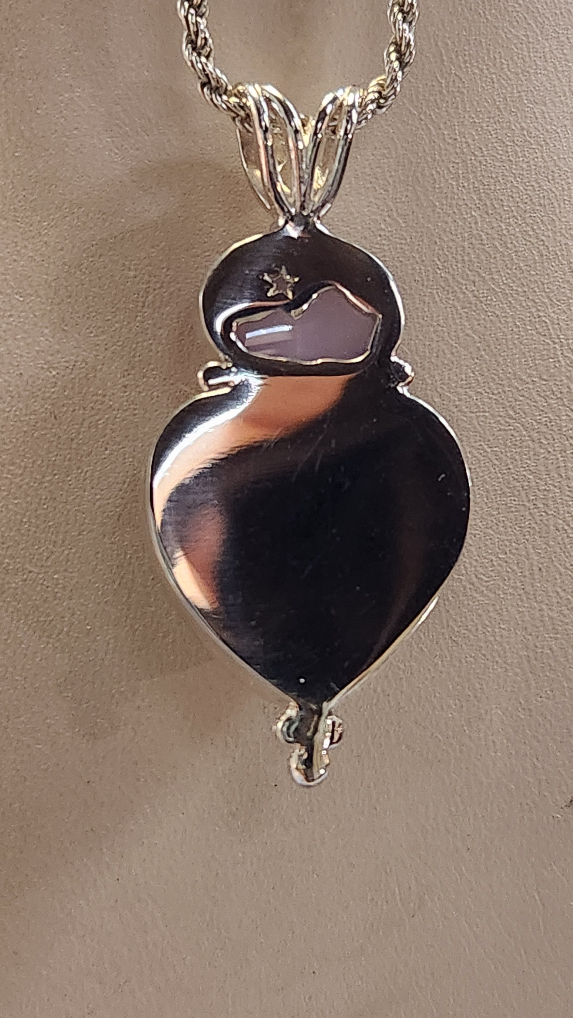 Another celebration of American gems. The top gem is a Holley Blue agate from Oregon. Weighing in at 39.46cts, the bezel set high dome heart shape colorless topaz is from Mason county, Texas, showing internal growth characteristics and a bit of its outside surface. The gems are set in Continuum sterling silver, hand made by Rae Botke of Portland Oregon. The outline of a star above a mountain silhouette salutes the home of these gems. An 18 inch sterling silver rope chain with lobster clasp is included. It measures 1 3/4X3/4 inches