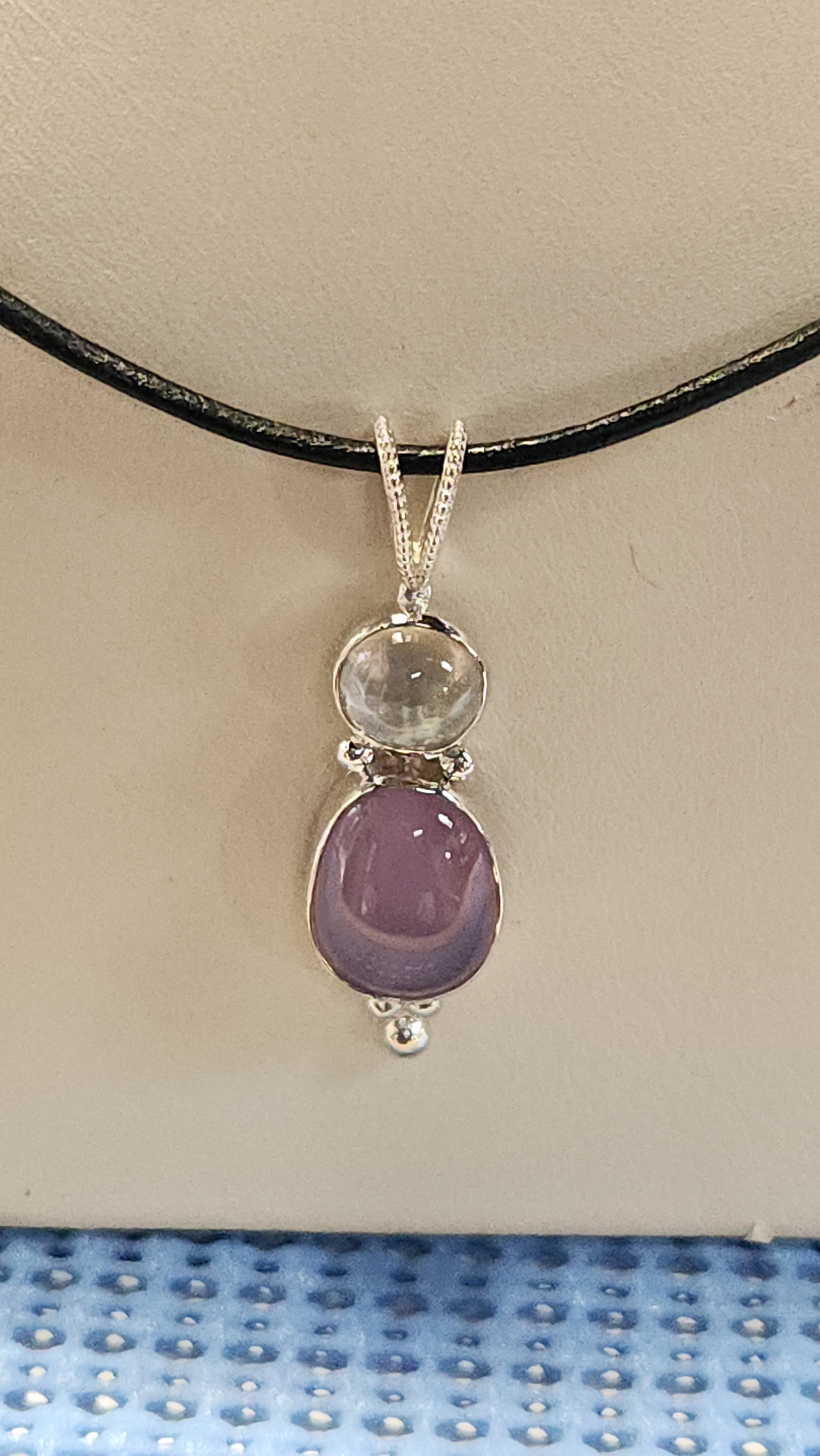 Another celebration of American gems. The top gem is bezel set round cabochon of 3.22ct Texas topaz from Mason county, Texas. The bottom gem is a Holley Blue agate from Oregon. The gems are bezel set in Continuum sterling silver to tame the tarnish. Hand made by Rae Botke of Portland Oregon. With a star over mountains on the back recognizes the sources of the gems. A cord with lobster clasp is included. It measures 1 5/8 X 1/2 inches.